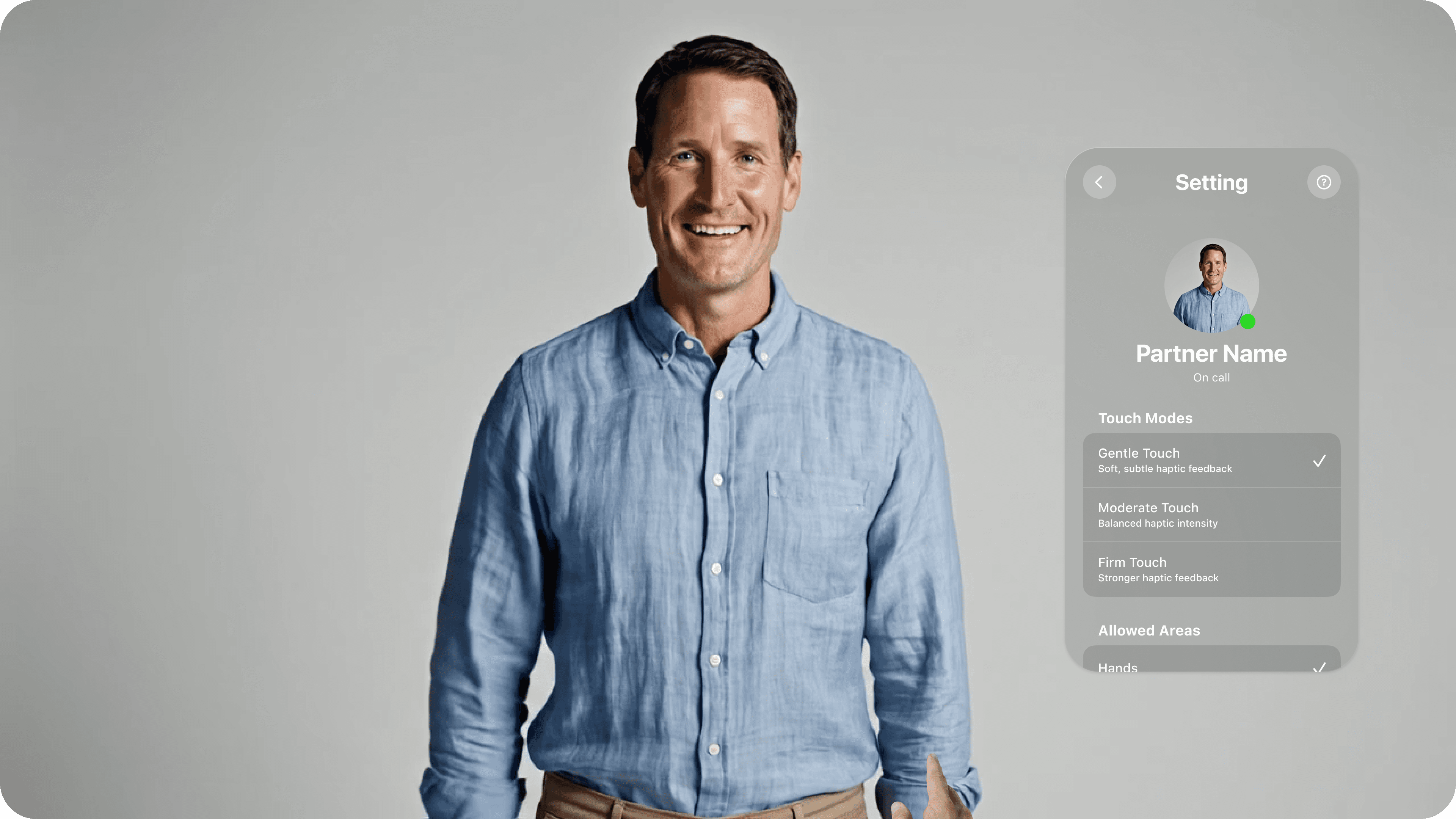 Emphasised consent and control at every step with explicit touch‑mode selection, adjustable intensity, opt‑in touch areas, and clear pause/stop options.