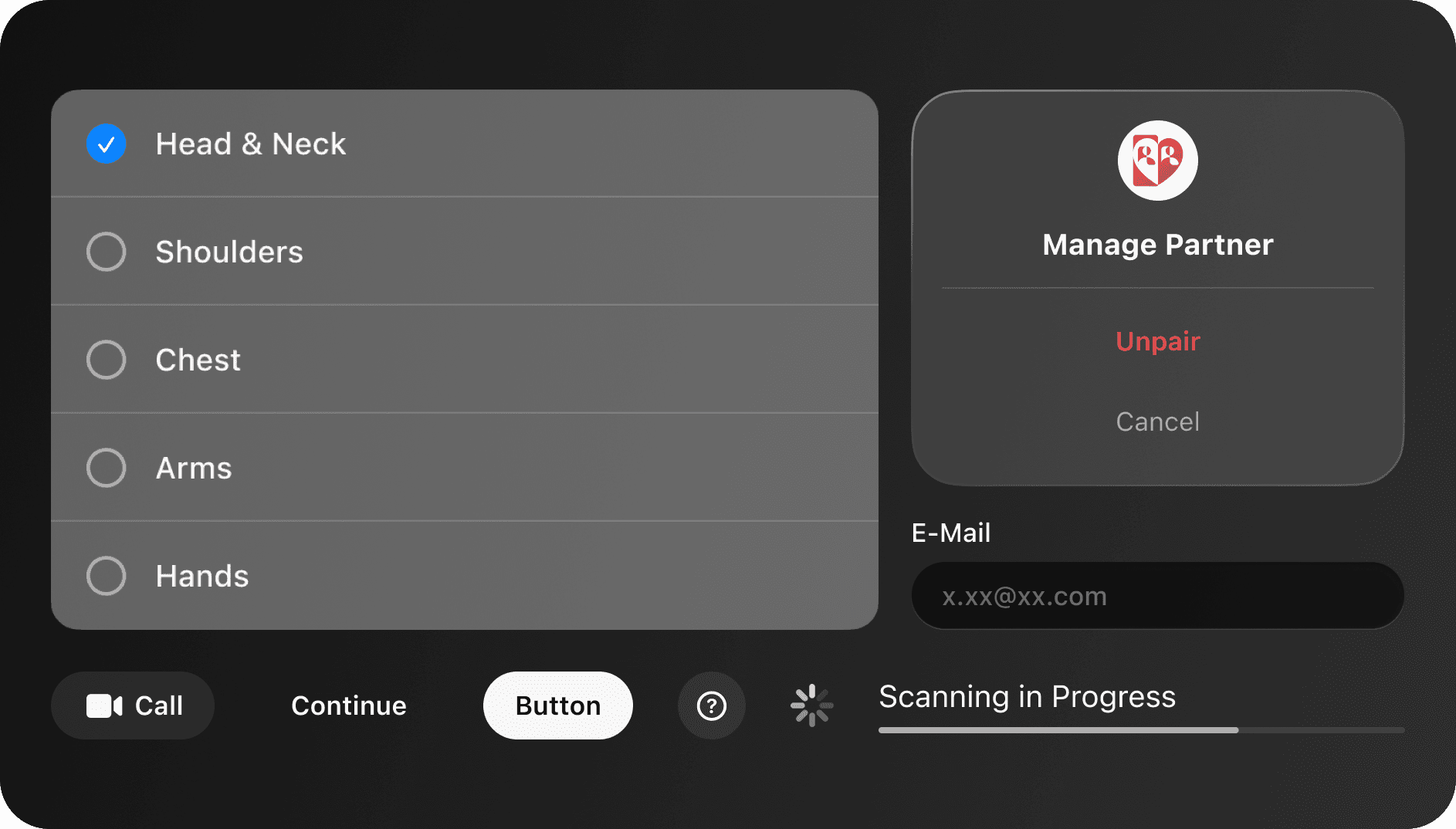Designed a session flow from launch to summary: pairing headsets and suits, selecting touch modes and allowed areas, choosing a scene (date spot, relaxing couch, MR space), interacting with 3D avatars, triggering bi‑directional haptic patterns, and ending with a gentle wind‑down and session recap.